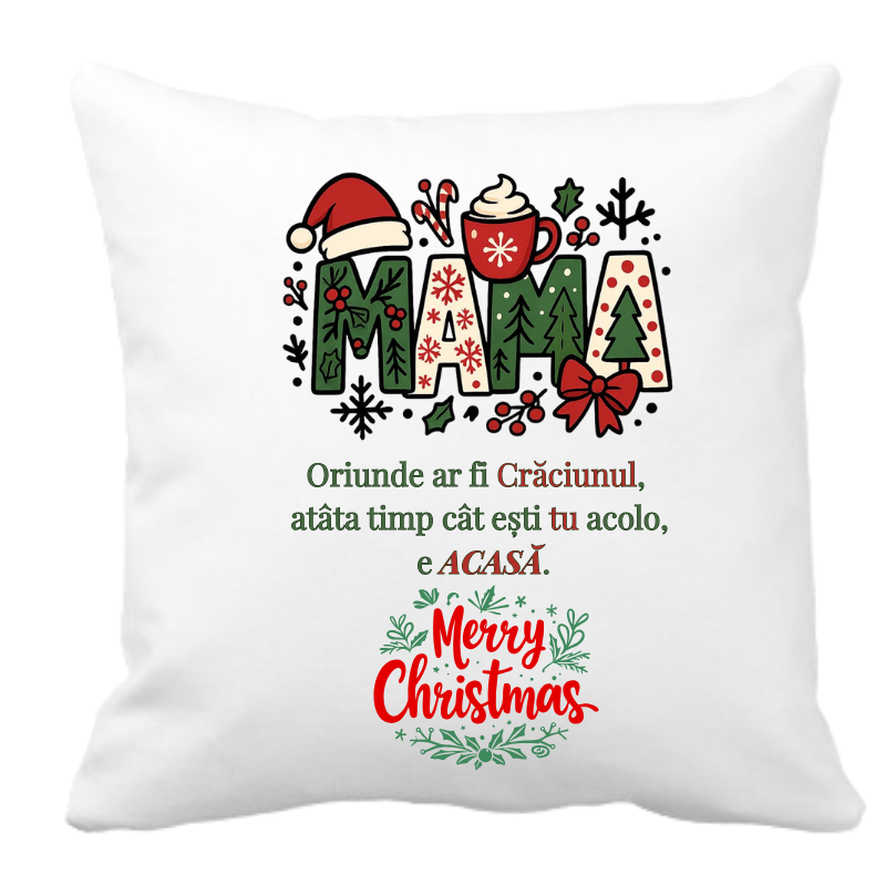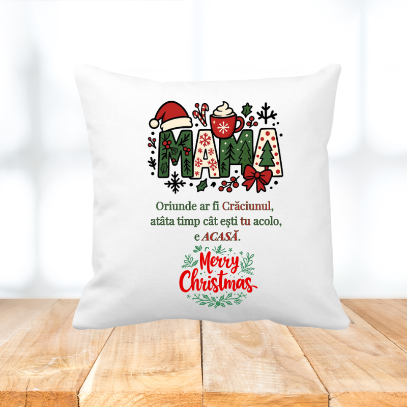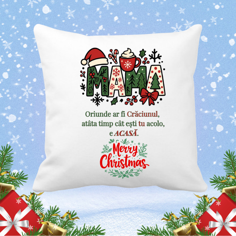 Adaugă un plus de farmec sărbătorilor cu această pernă decorativă de Crăciun, personalizată cu un mesaj special pentru Mama!